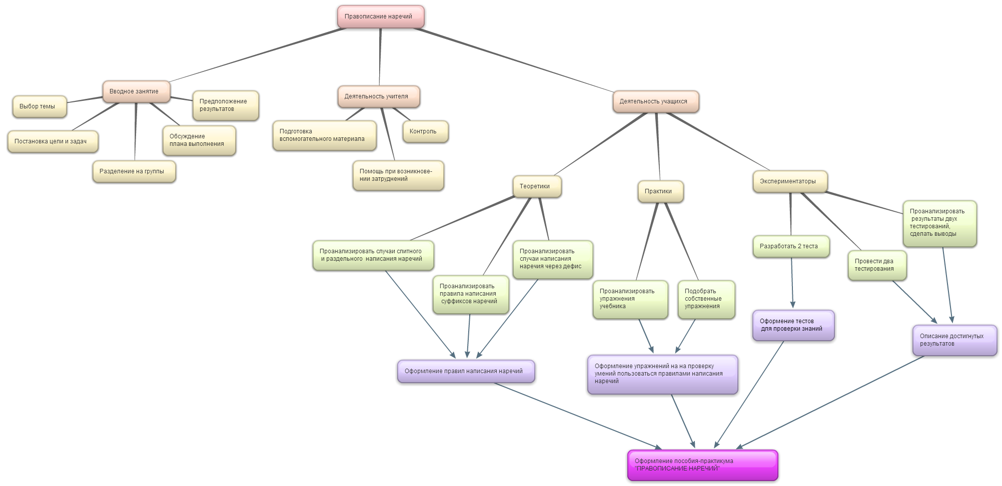Ход работы над проектом: класс делится на 3 группы для практического и теоретического изучения данной темы, а также экспериментального подтверждения эффективности упражнений и оценки уровня знаний. Учитель разделяет учащихся на команды путем жеребьевки. В результате полученные материалы оформляются в единое пособие-практикум.