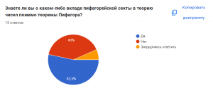 Большинство участников опроса имеют представление о кладе пифагорейской секты в теорию чисел помимо теорему Пифагора. Однако значительная доля участников не обладает такими знаниями, что подчеркивает необходимость дальнейшего образования или информирования в этой области.