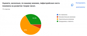 53,3% опрошенных признают значительное влияние пифагорейской секты на развитие теории чисел. При этом 40% участников затруднилась с оценкой, а мнение о незначительном влиянии практически отсутствует.