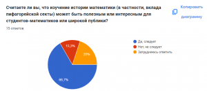 60% участников опроса поддерживают идею о том, что изучение истории математики и вклада пифагорейской секты может быть полезным или интересным как для студентов-математиков, так и для широкой публики.большинство опрошенных поддерживают изучение истории математики и считают его полезным или интересным. В то же время некоторая часть участников либо затруднилась с ответом, либо не видит в этом смысла.